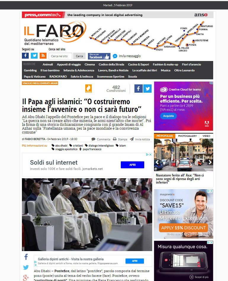 La visita del Papa negli Emirati Arabi è un evento importante, perché non è mai accaduto, ed è certamente un buon segnale di rispetto reciproco fra religioni diverse. Il suo discorso integrale all'Incontro Interreligioso presso il Founder's Memorial può essere seguito al link su Youtube di TV2000, dura ventisei minuti che sono ben spesi per farsi un'opinione diretta, non filtrata dai vari mezzi di informazione e disinformazione: